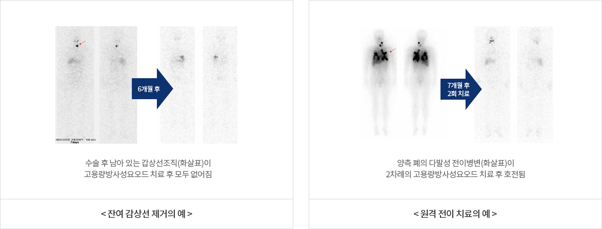갑상선에 선택적으로 흡수되는 방사성요오드를 이용하여 갑상선암의 수술 후 잔여 조직을 제거하거나 갑상선암 전이암을 치료합니다. 갑상선기능항진증 환자가 항갑상선제에 반응을 보이지 않거나 재발하는 경우에도 방사성요오드를 이용하여 치료할 수 있습니다.