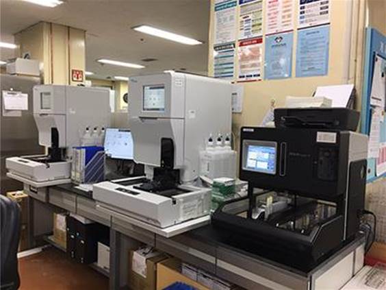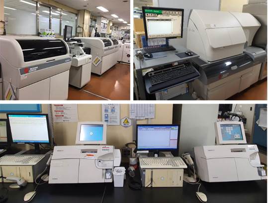 주요 장비로 Beckman AU5800, Rapidlab 1265 gas analyzer, Unicel DxI 800 등을 운용하고 있습니다.