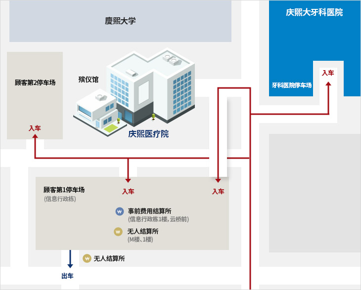 | 京釜高速公路 | 京釜高速公路→进入盆唐1公里左转→清潭大桥→北部干线→东部干线(上溪洞放港)→清凉里→庆熙大学(医疗院)铁路使用时 |
